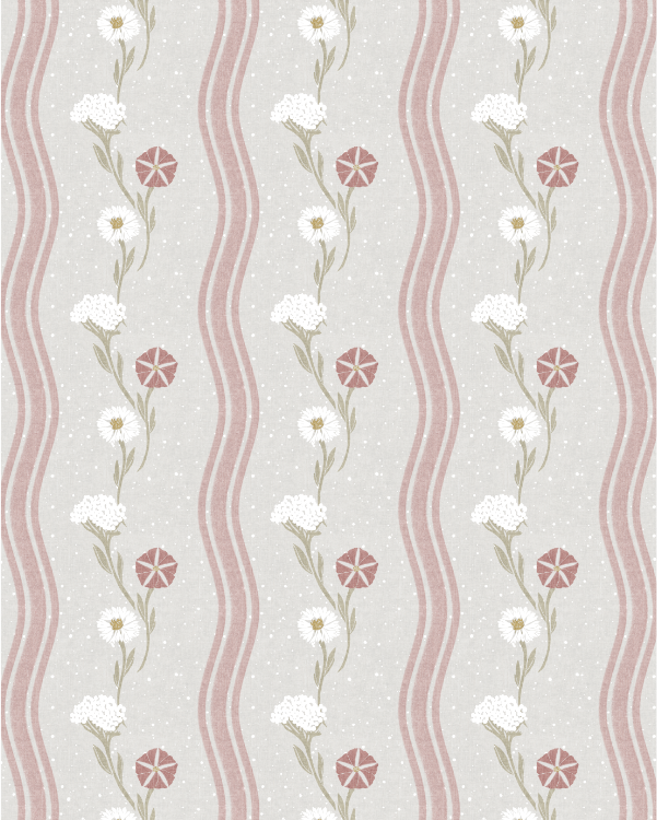 Available in soft pink and green, a fresh blue and yellow, and a muted aubergine with green, each colourway offers a different mood while staying true to the cottage garden spirit. Perfect for wallpaper, fabric, and home décor, every design is made to order with sustainable printing and free custom colour or scale adjustments on request.