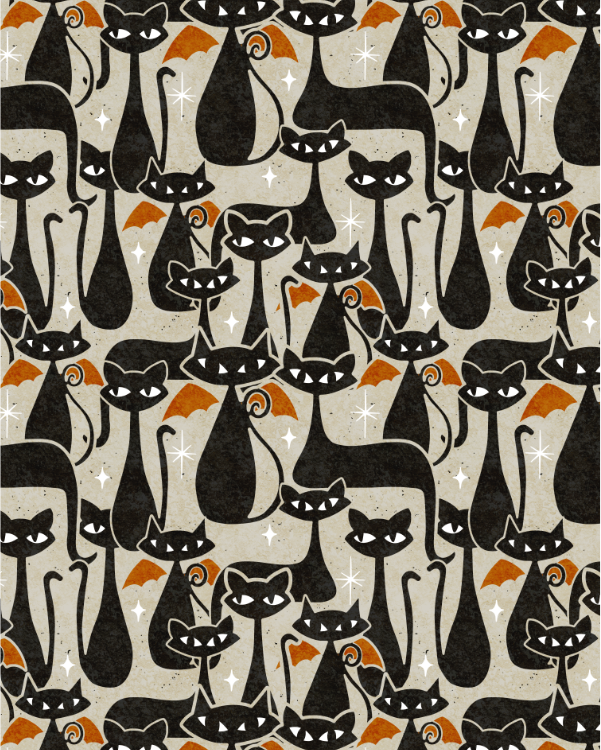 Mid-Century Modern Halloween is a playful retro set of spooky pattern designs featuring atomic cats, quirky dice, pumpkins, bats, and tiny skeletons.