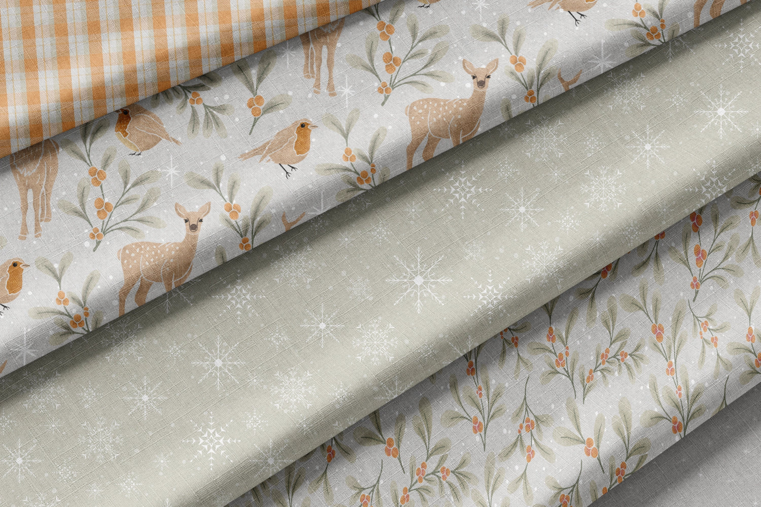 Woodland Christmas is a calm, nature-inspired set of festive pattern designs featuring deer, robins, mistletoe, snowflakes, and warm seasonal plaids. With soft earthy tones and a timeless feel, these fabrics bring a more natural touch to Christmas, perfect for cosy, handmade projects.